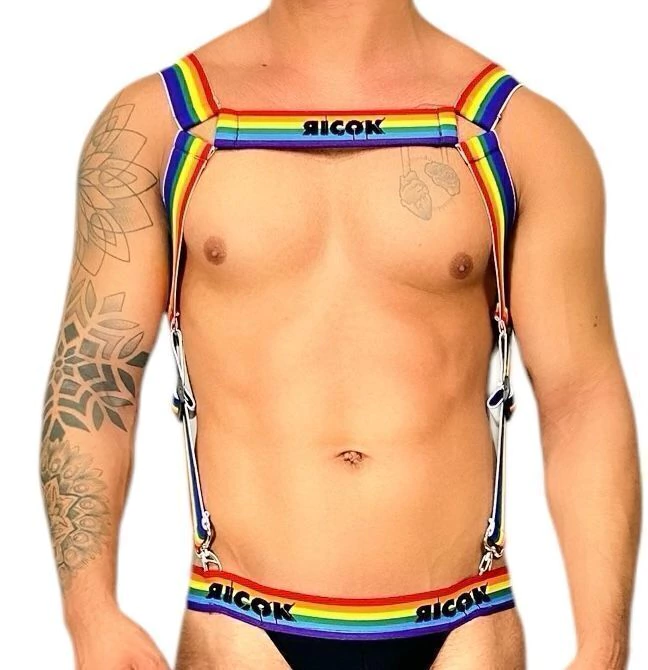 Este Harness Supensorio Pride é perfeito para quem quer um visual ousado e se sentir confiante. Inspirado no visual da subcultura do BDSM, o arnês de elástico da Ricok, veio com bastante força nas noites do país à fora.